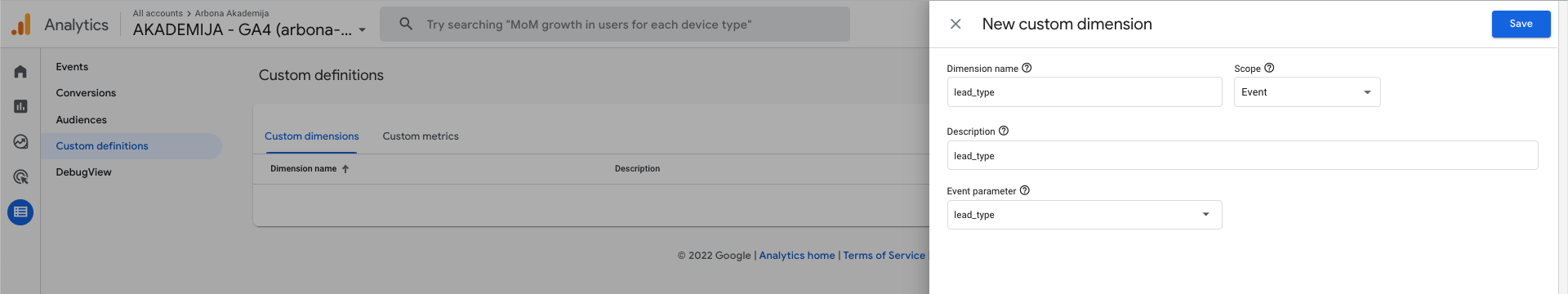 To su dodatni parametri koje je još potrebno uključiti na strani Google Analyticsa. Ako ne napravite ovaj korak, u pkviru GA4 prikazivaće Vam se samo naziv event-a (generate_lead), ali bez tih dodatnih parametara. Ipak nas ovde zanima na koje tačno mail-ove i telefone su ljudi kliknuli (pogotovo ukoliko ih imate više na svojoj stranici, recimo za svako odeljenje zasebno).