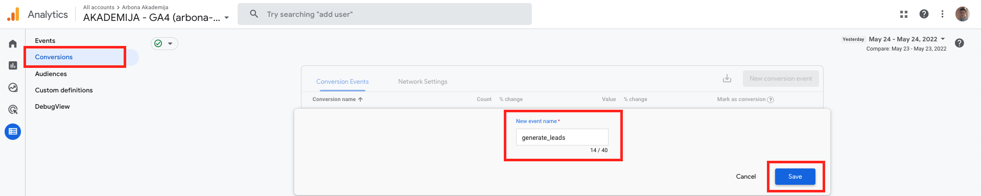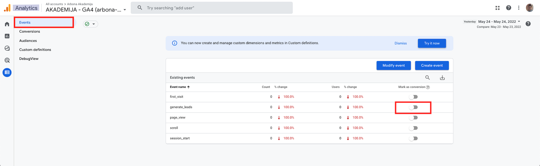 generate_leads kao konverziju. Postoje 2 načina kako podesiti event kao konverziju. Jedan je da već postoji Event podesite kao konverziju. Ovo je moguće napraviti samo kada je navedeni event već napravljen na web-u. Potrebno je otići u