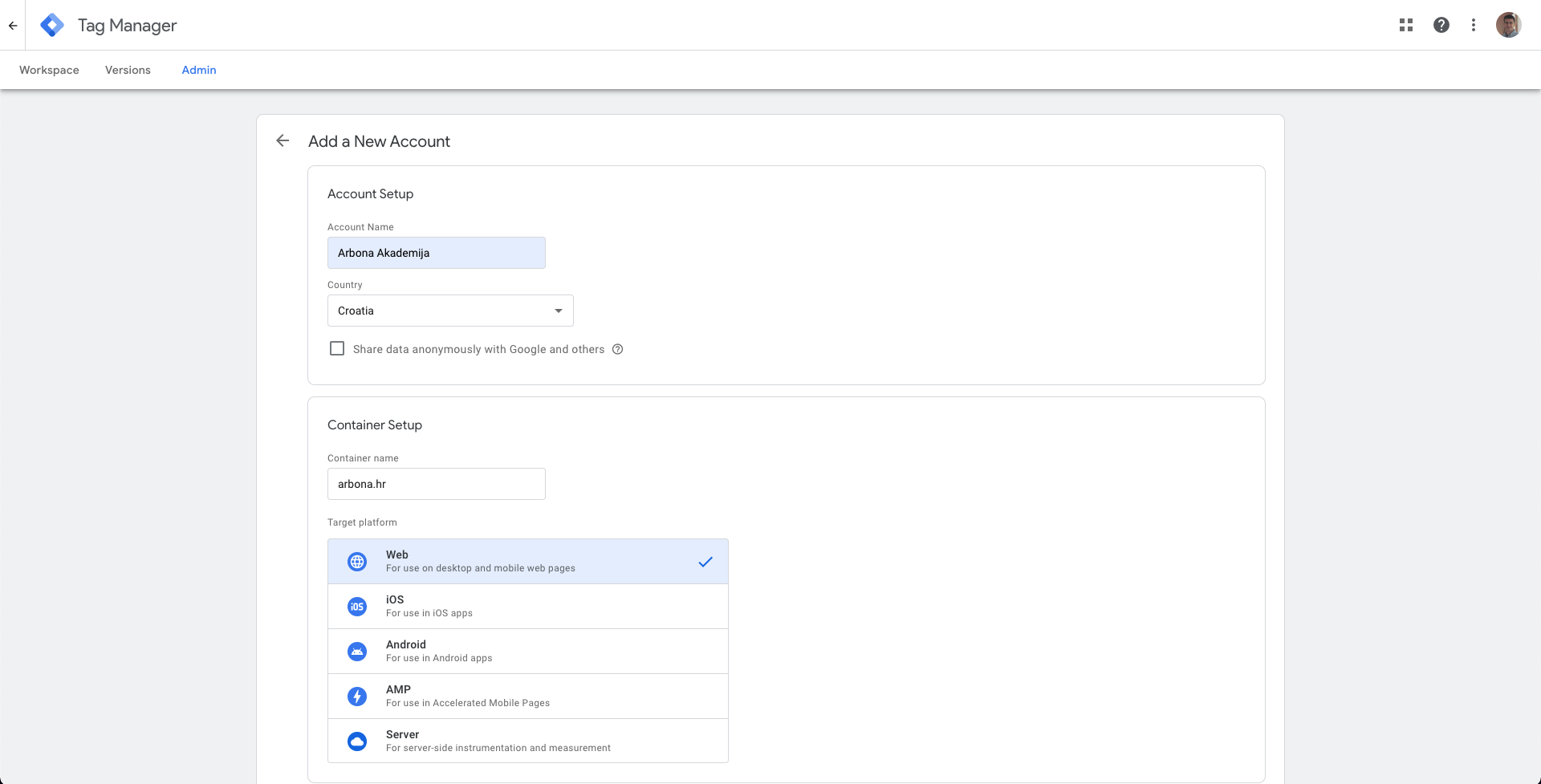https://tagmanager.google.com/ i kreirajte novi nalog. Stavite naziv Account-a koji će biti lak za pretraživanje (npr. Arbona), nazovite Container prema domenu (npr. arbona.rs) i odaberite platformu Web.